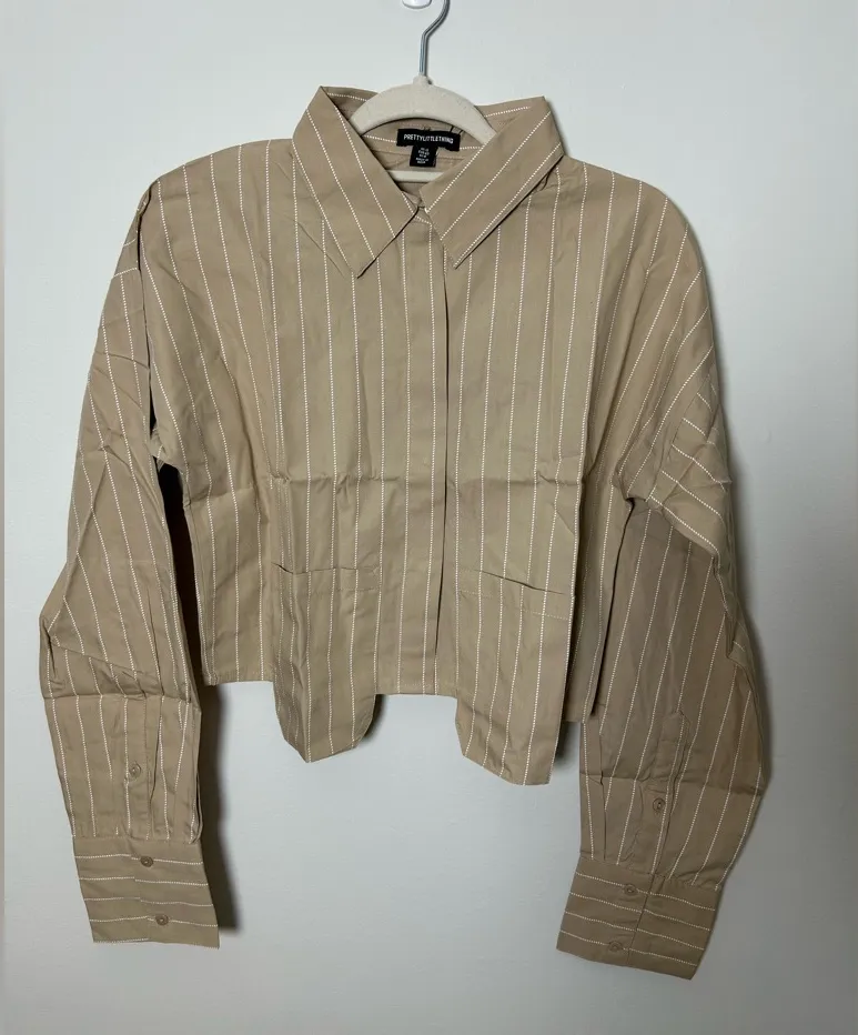 PrettyLittleThing Stone Poplin Pinstripe Pocket Detail Cropped Shirt Tan Size 8 - $16 New With Tags - From Briana