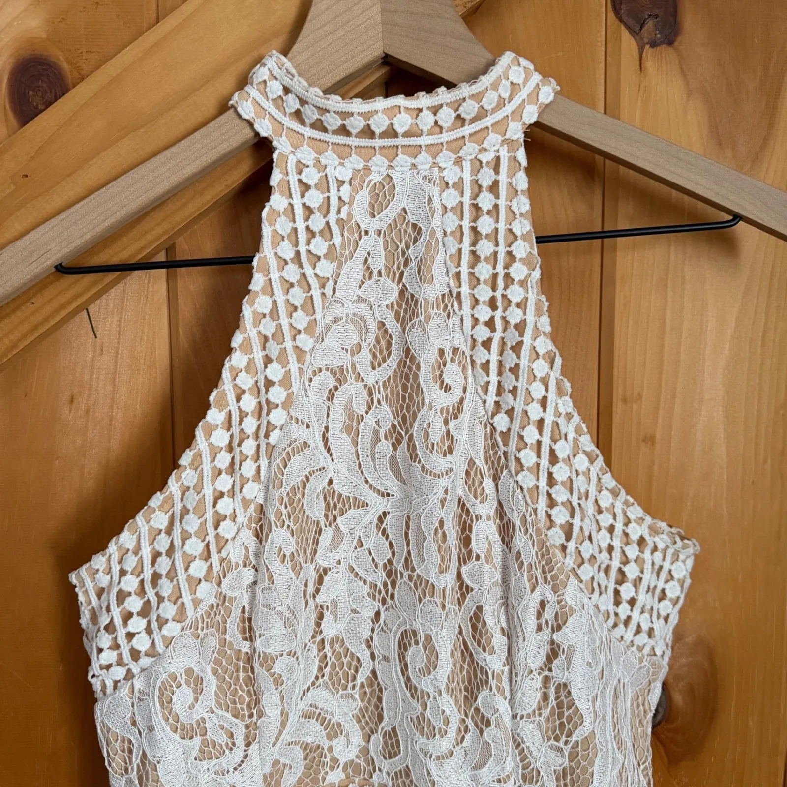 Captivate with this stunning white lace midi dress. Its intricate lace overlay reveals a flattering nude lining, creating a sophisticated and elegant silhouette. The high halter neckline draws attention upward, while the fitted sheath design accentuates your curves beautifully. Delicate crochet detailing along the neckline, waist, and hem adds a touch of refined charm. The back features a zipper closure for a seamless fit and a tasteful slit at the hem allows for graceful movement. Perfect for weddings, garden parties, or a chic evening out. Preowned and good condition Approx Measurements: • Pit 2 Pit: 15 in • Waist: 12.5 in • Length (neckline to bottom hem): 43 in Keywords: white dress, lace dress, sheath dress, halter neck, midi length, elegant, formal, special occasion, evening wear, party dress, wedding guest, cocktail dress, couture, sophisticated