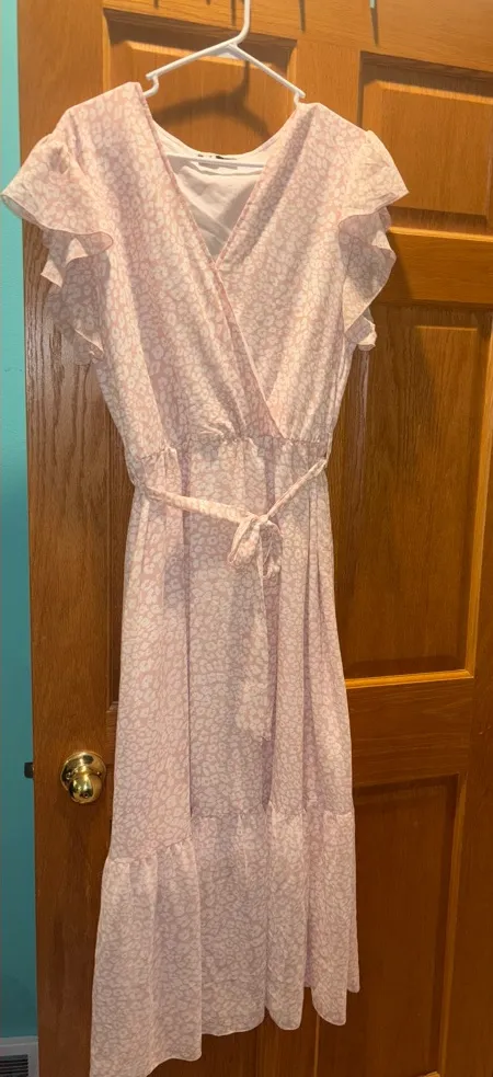 NWOT. Bought brand new from Amazon and missed the return window. Very elegant light pink with cheetah accents. removable tie around waistband. Has snap button in front of bust. In perfect condition. Dress was too large for me. Would work well for a larger busted chest.