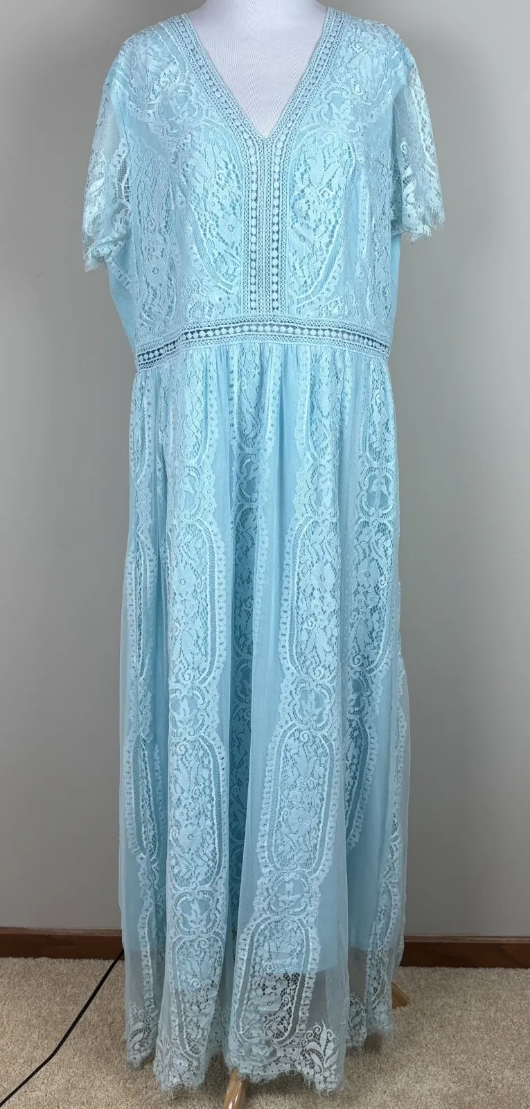 Pretty Garden Maxi Dress Womens XXL Blue Lace Floral V-Neck Short Sleeve Fairy Very good condition!... Show more