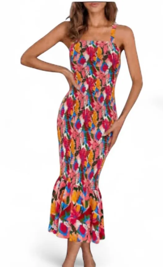 Size Medium Vibrant floral print dress with a ruffled hem. Features bold colors for a standout look. Strappy Bodycon Floral Print Tank Dress Casual Sundress Ruffle Hem Mermaid Smocked Detail all the way down until the ruffle hemline Flat Lay Measurement pit to pit unstretched 15 3/4 length 41