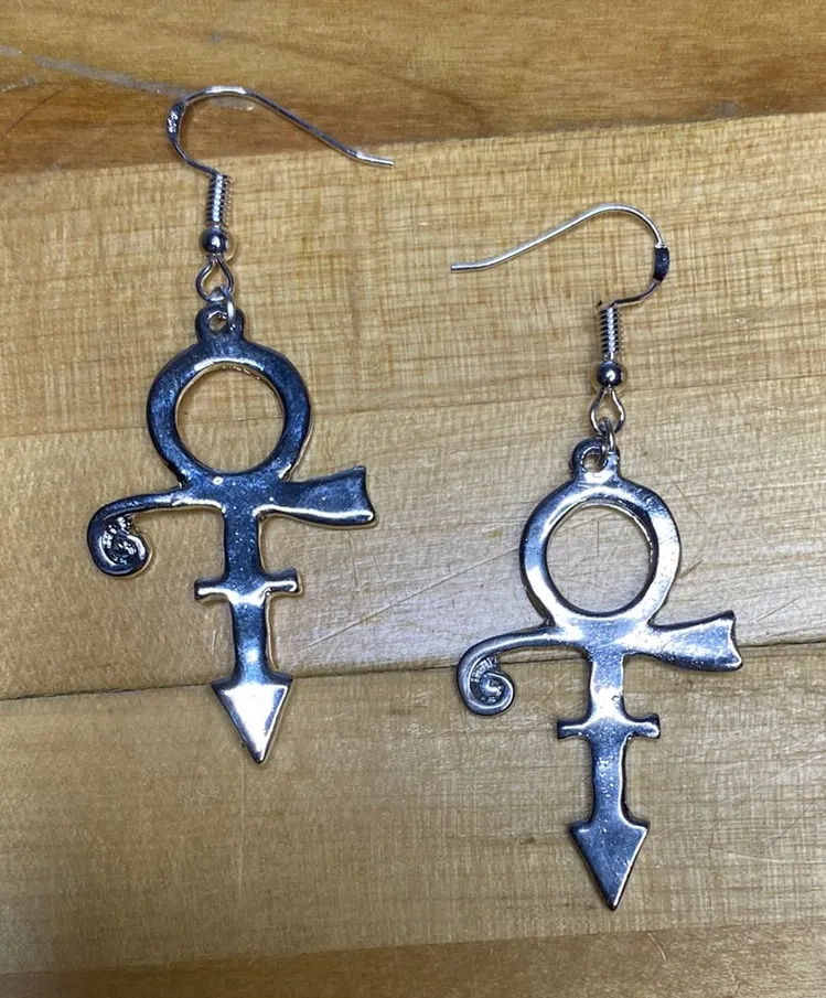 Make a statement with these striking Prince symbol earrings! These eye-catching earrings feature the iconic Prince symbol in a sleek, silver tone. The dangle drop design adds movement and flair, ensuring they catch the light and attention wherever you go. These earrings are perfect for adding a touch of rock-and-roll edge to your everyday look or for showing your love for the legendary musician. Ideal for concerts, parties, or simply expressing your unique style. 47