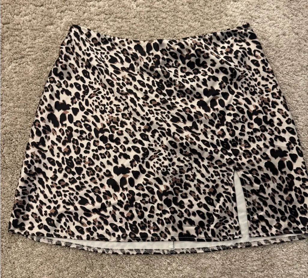 Trendy mini skirt with striking animal print. Ideal for a fashionable outfit.