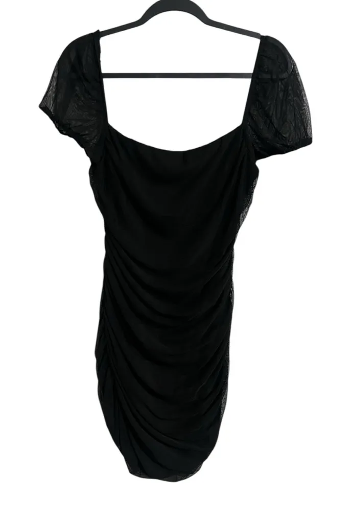 Size 10 Chic black mini dress with ruched detailing. Features short sleeves and a square neckline. P... Show more