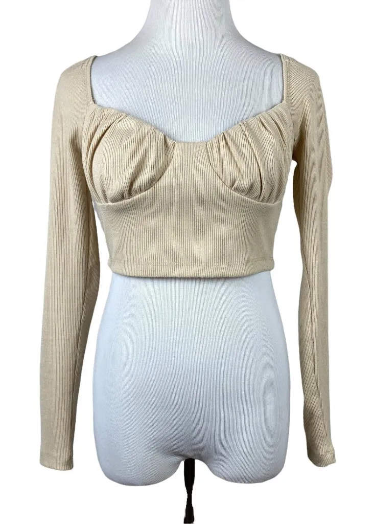 Princess Polly Crop Top 6 Beige Ribbed Knit Sweetheart Neckline Long Sleeve Ruched Women's Very goo... Show more