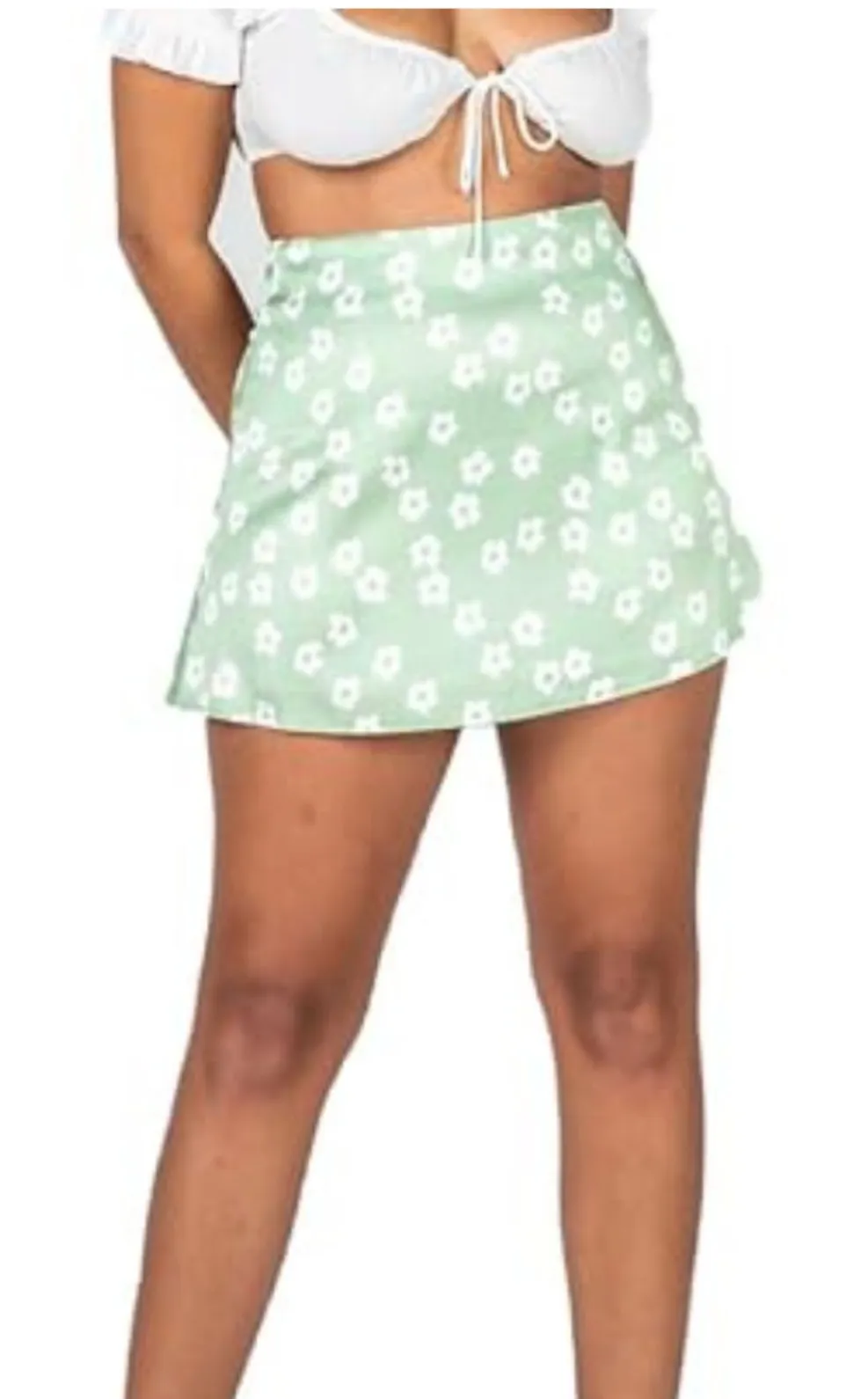 PRINCESS POLLY Light Green White Floral Silky Mini Skirt with a back zipper closure. Size: 4 Measu... Show more