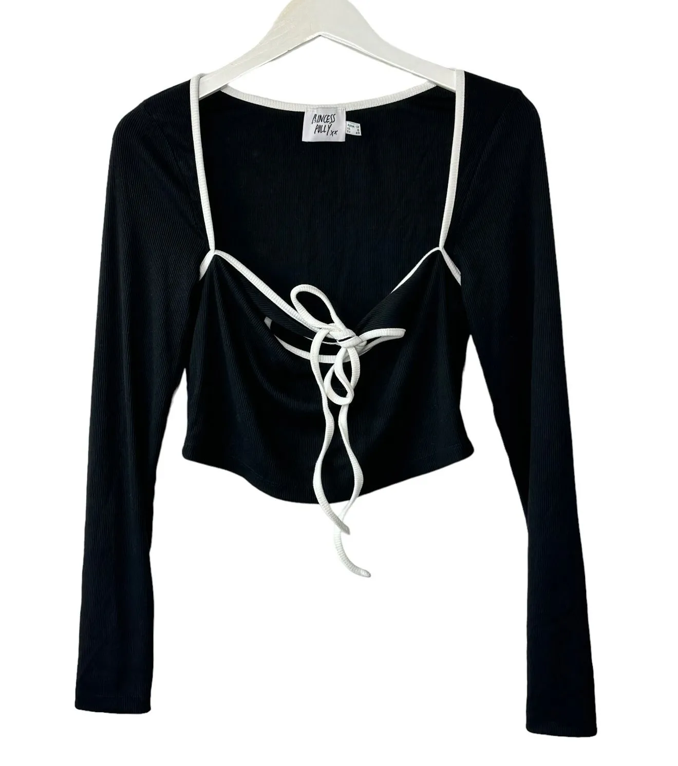 Princess Polly Black Long Sleeve Top White Trim Circle Chest Cut-Out Size 8 Chest 16" Length 15... Show more