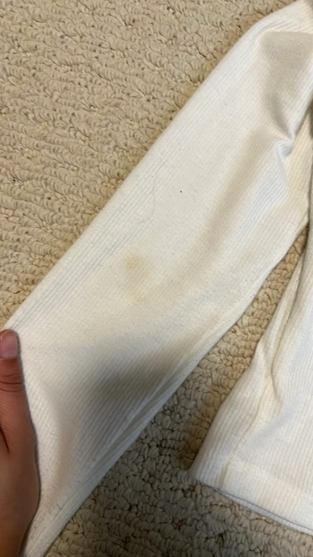 Has a keyhole and is a bit see through. Has a stain on the back left sleeve
