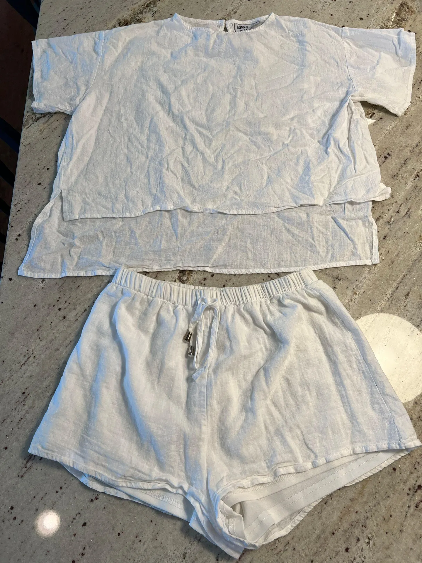 Crisp soft white Cotton Linen Blend Polly Princess white shorts set. Breezy oversized Tshirt cut wit... Show more