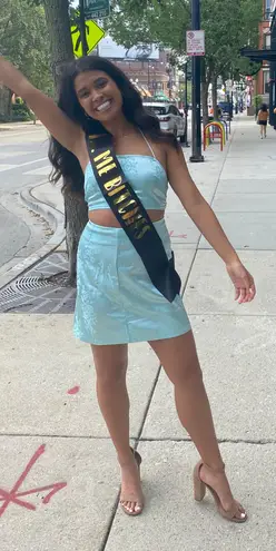 Two piece set in a vibrant blue. Super cute and ready for the summer. Can be dressed up with the per... Show more