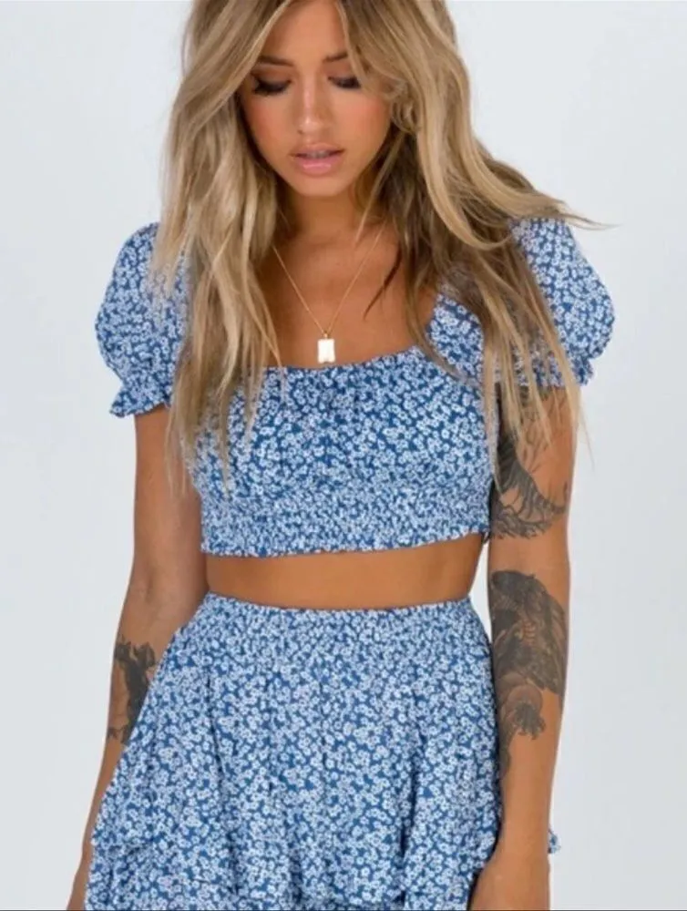 Princess Polly The Meadow Top Blue and White Floral Size 4 Puff Sleeve Crop Top Hidden sid... Show more