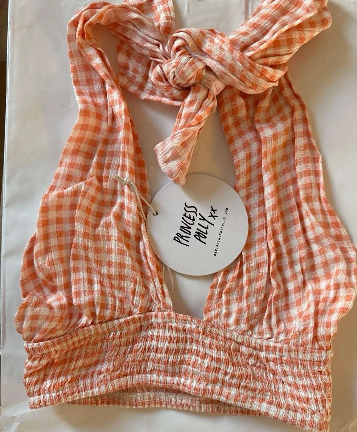 orange gingham print, halter tie neck so can be worn a few different ways!