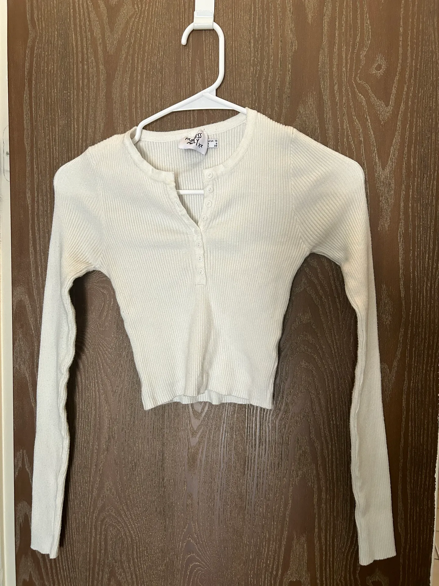 Princess Polly white sweater, long sleeves, ribbed material, white buttons, that button up 3/4 the w... Show more