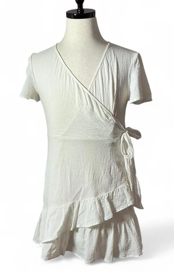 White textured wrap mini dress. A flattering V-neckline and true wrap closure secured with a side ti... Show more