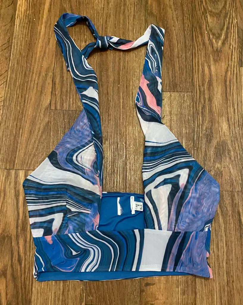 Stylish blue and purple patterned garment. Perfect for any occasion. Inside tag was cut out Band at... Show more