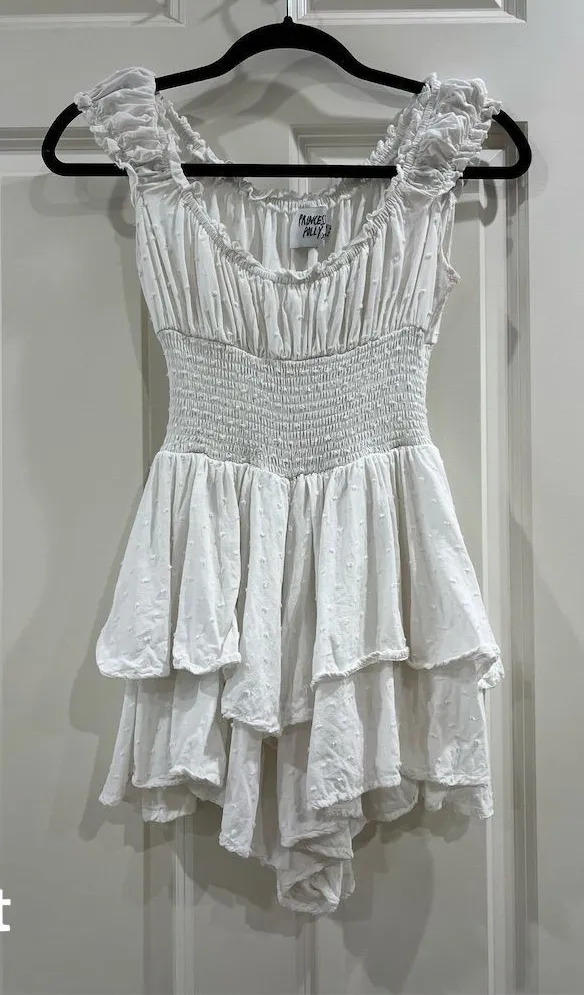 Keywords: Princess Polly, summer dress, romper, mock dress, casual dress, white dress, sleeveless, tiered dress, flowy dress, ruffled straps, smocked waistline, square neck, women's fashion, pre-owned dress, summer style, brunch outfit, feminine dress.