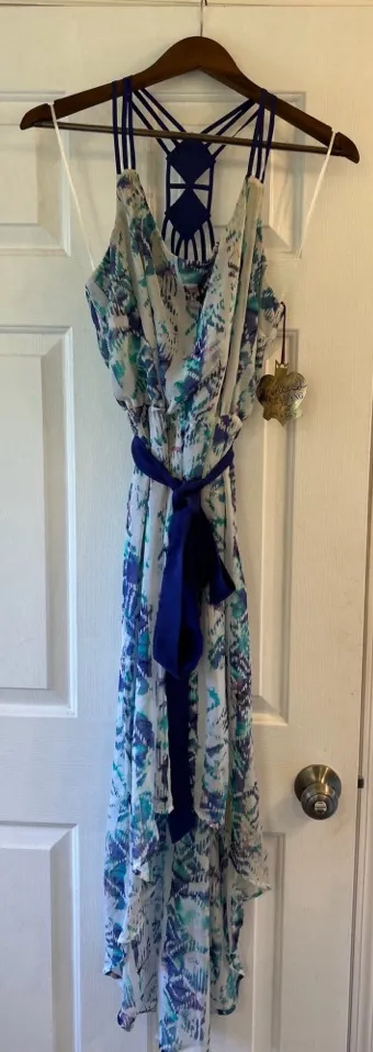 Chic high low dress with blue and white pattern. Strappy back design. Perfect for stylish outings.