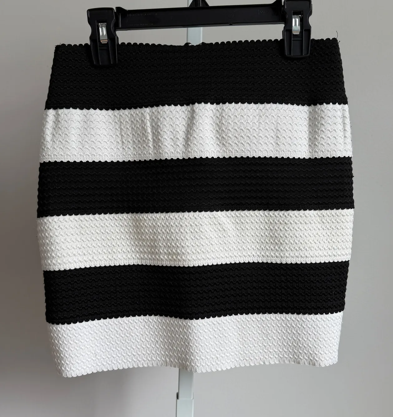 Pristine Bandage Black & White Striped Skirt Gently used with no flaws Bold and chic, this Pristine mini skirt features wide black and white horizontal stripes with a textured waffle knit fabric. Designed with a flattering bodycon silhouette and exposed gold zipper at the back. Perfect for pairing with a fitted top or blazer for a mod-inspired statement look. Size Small. Measurements: Waist: 28”–34” Hips: 15”–38” Length: 14.5” #NN35 Weight: 8 oz striped mini skirt, textured knit skirt, monochrome bodycon