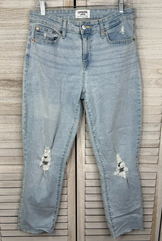 Gently used and in great condition. Mid Rise Boyfriend jeans in a stretchy light wash denim. -5 pocket style -Front zip/button closure -Stretch denim -Distressing and unfinished hem -Light wash -84% cotton, 14% polyester, 2% elastane -Waist measures 15.5" across, rise is 10" and inseam is 27" (Ref M) (J36)