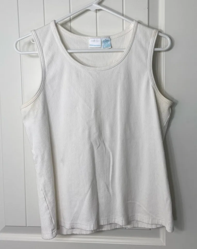 ProSpirit women’s white ribbed stretch sleeveless thick strap tank top shirt Size XL In good used condition *has some staining around the armpits and a marking on the one strap as shown Smoke free home! All items are lint rolled before shipping :) Pit to pit 18 inches, length from shoulder 22 inches