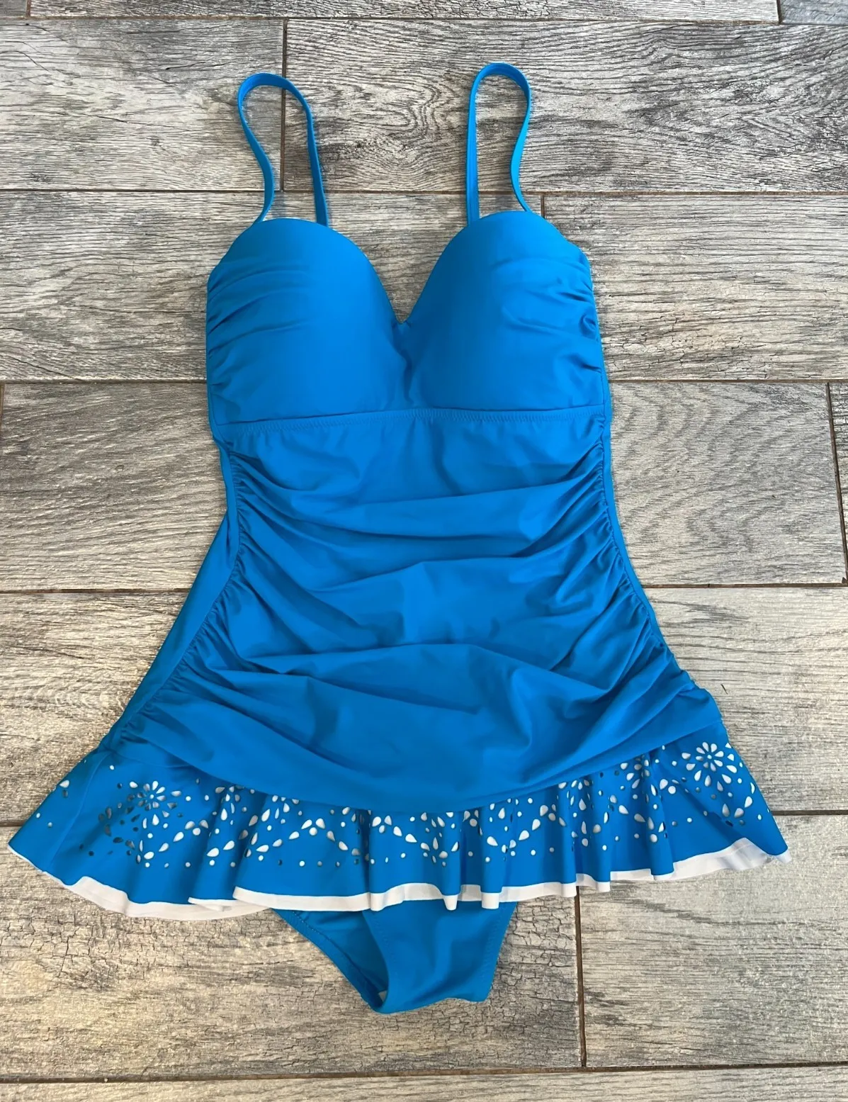 Profile by Gottex Enchantment Bandeau One Piece Swimsuit size 10 Swimdress Womens Modest Item 622-2047 Tutti Frutti Peacock Blue is Crayola Robin Egg's Blue. Swim dress has Laser cut ruffle bottom, adjustable and removable straps, Tummy control, Soft Cups, SPF sun protection . 72% Polyamide 28% Polyester bathing swim suit. Great new without tags condition. Discontinued and sold out online. 6984.20250823 80