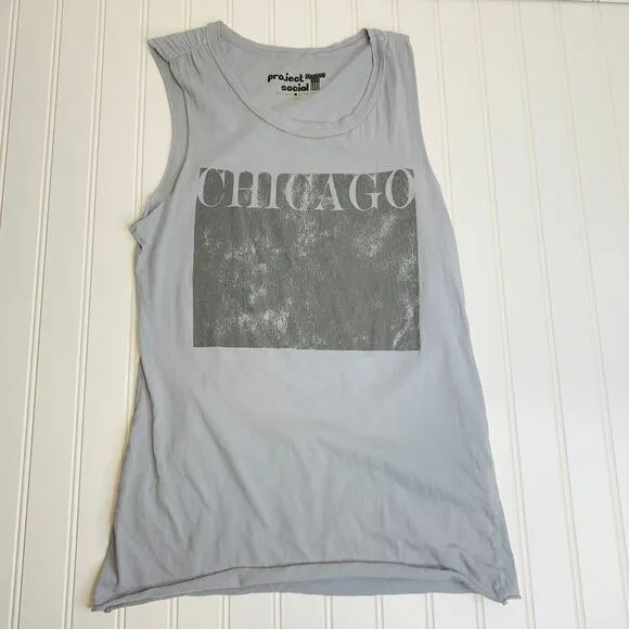 Project Social T Chicago Graphic Muscle T Shirt muted gray Blue w Gray Black graphic Sz XS Measurem... Show more