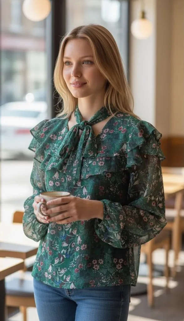 Promesa Green Floral Ruffle Tie Neck Blouse Size Small – Sheer Long Sleeve Boho Top Elevate your wa... Show more