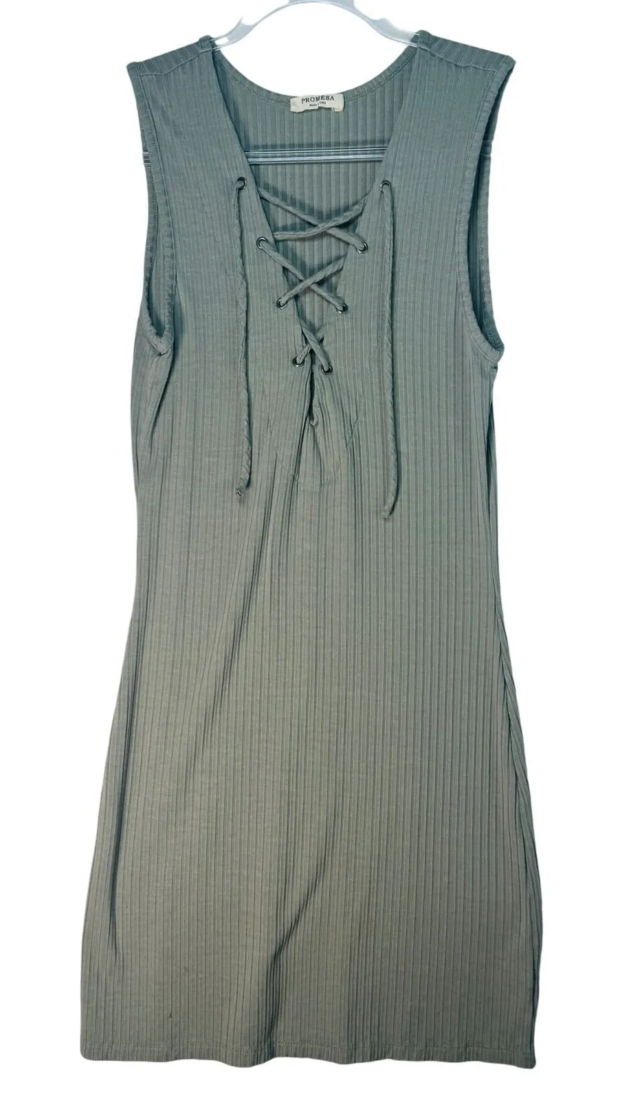 Promesa women's ribbed sleeveless knit dress in sage green, size M. Soft stretch rayon-spandex blend with lace-up V-neck detail for a flattering boho-meets-minimalist look. Made in the USA. Lightweight, comfy, and perfect for festival style, coastal casual outfits, cottagecore soft-girl looks, or easy summer layering. Flattering column silhouette with subtle texture. promesa womens dress sage green rib knit lace up boho cottagecore minimalist soft girl aesthetic summer casual Condition as shown in photos. My home is smoke- and pet-free, but most items are preloved and sold as-is. Colors may vary slightly due to lighting. I aim to disclose any flaws, but please reach out with any concerns—I want your purchase to make you smile.