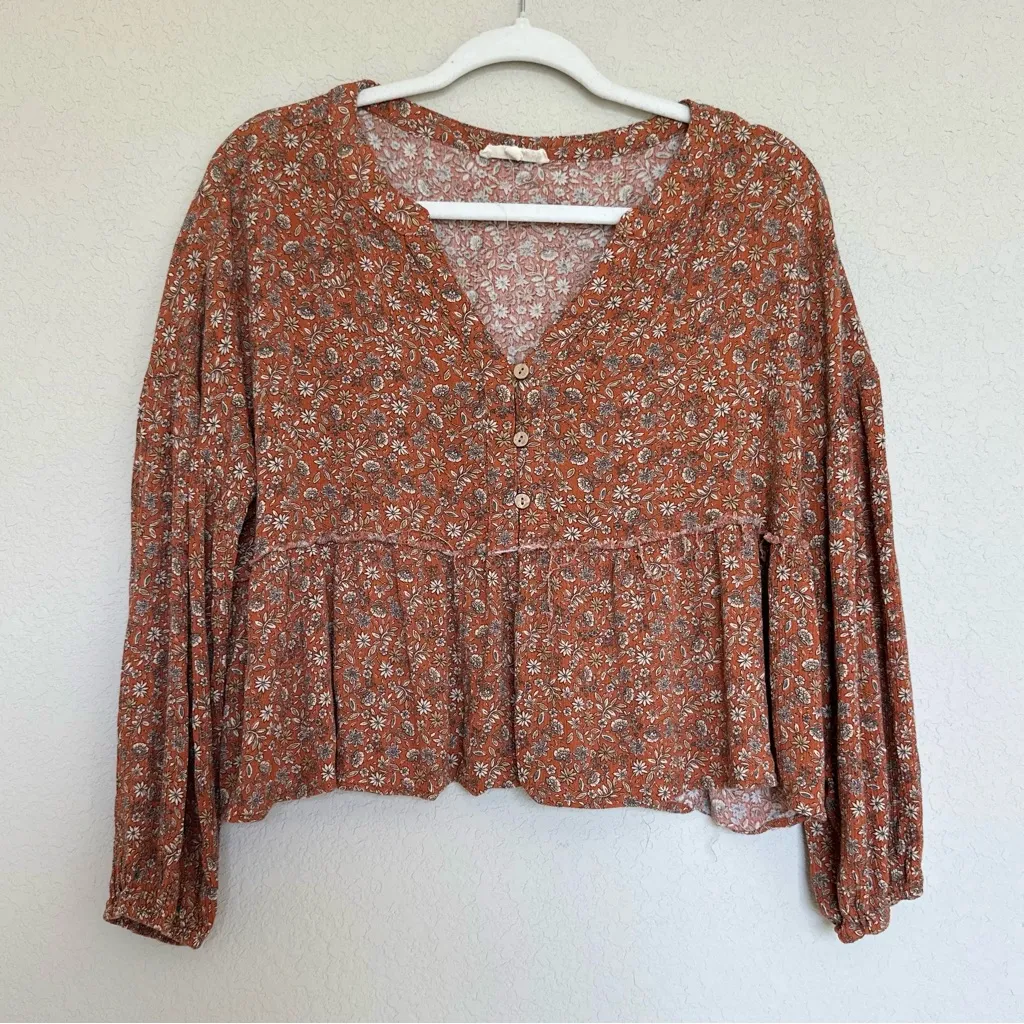 Boho Floral Button Front Blouse This lightweight boho blouse features a rust orange base with an allover white floral print. Designed with a relaxed, flowy fit, v-neckline, and button front detail. The gathered waist and billowy long sleeves add an effortless feminine touch — perfect for pairing with jeans, skirts, or cutoffs for a laid-back fall look. Size: Large Condition: Excellent, no flaws ✨Soft & breathable fabric 🌼Bohemian-inspired print 🍂Perfect for layering #bohostyle #floralblouse #fallfashion #bohochic #cottagecore #rustorange #flowyblouse #poshstyle #bohofashion #bohovibes