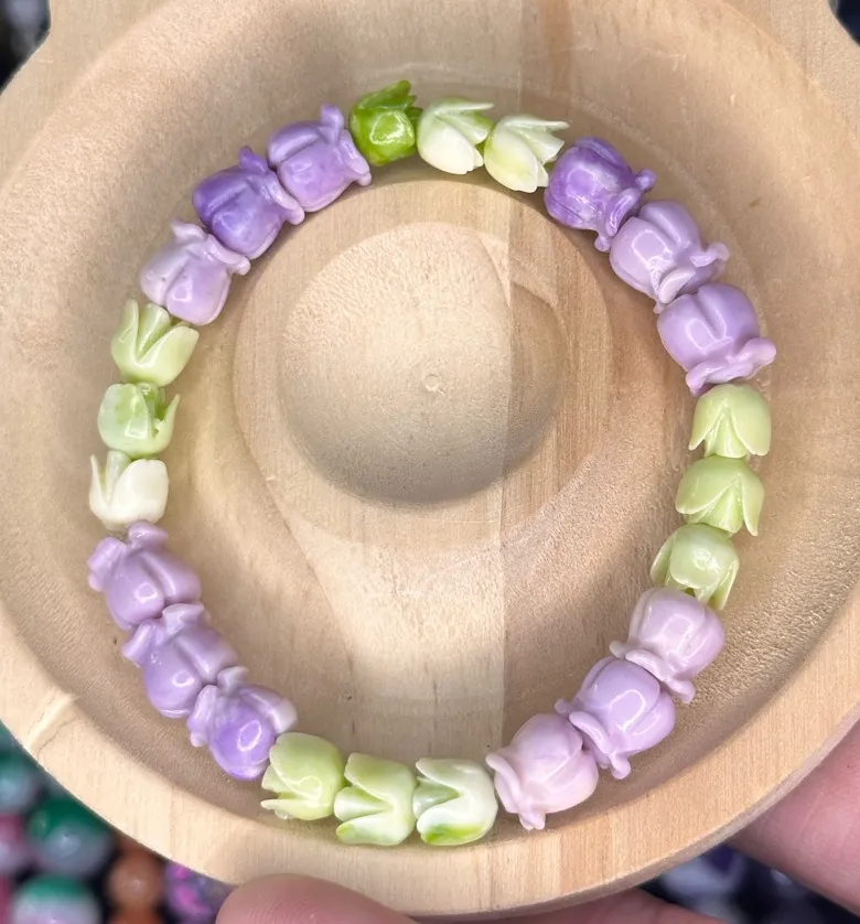 Adorn your wrist with this charming floral beaded bracelet, a delightful burst of spring hues. Each bead mimics the delicate shape of blooming flowers in soft purples and fresh greens, creating a whimsical and feminine accessory. The stretch design ensures a comfortable and easy fit for everyday wear. Perfect for adding a touch of cheerful elegance to your casual outfits, this bracelet is ideal for garden parties or a sunny day out. Style: Beaded, Wrap Type: Bracelet Main Stone Color: Purple Material: Resin, shell Charm Type: Bead Theme: Flowers & Plants, Bohemian Shape: Flower Number of Gemstones: 22 Main Stone Shape: Chip Item Length: 7 in Occasion: Birthday Features: Stackable Era: Undated Unit Type: Unit Keywords: floral bracelet, beaded jewelry, stretch bracelet, handmade bracelet, boho jewelry, flower beads, purple green, dainty bracelet, feminine style, spring accessory, garden party, daytime wear