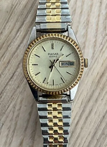 Brand: Pulsar Model: V828-0050 A4 Gender: Ladies Description: Vintage watch! Two-tone stretch bracelet. Gold-tone dial, markers, and hands. Day and date windows. Just cleaned and serviced with a new battery installed. Works well! Condition: Great. New crystal was just installed. Works well! Band/Bracelet Type: Two-Tone Stainless Steel stretch bracelet adjusts to fit almost any size of wrist. Date Window?: Yes Power Type?: Quartz, Battery New Fresh Battery Installed?: Yes Box?: No Additional Links?: No Notes: Please see pictures for condition and measurements. Watch pillow are for photography staging only and are not included, unless otherwise stated. From a smoke free, pet free home. Condition Notes: -NWOT: New Without Tags. Brand new item. May have super light handling marks, if any. Item may have been a window display item for a short time before safe storage. -Like New: Extremely minor handling or wear marks, if any. Item may have been worn once or twice. -Excellent: Minor, but more noticeable light wear marks on band, case, and/or very light scratches on crystal, if any. -Great: Above average condition for the age of the watch. Light to moderate surface wear or scratches. -Good: Expected wear marks for typical standard use for the age of the watch. Noticeable surface scratches on band, case, and/or crystal. -Other: Will be described if applicable.