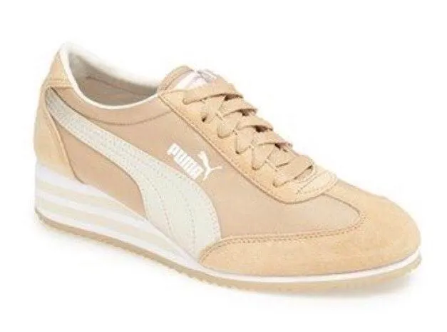 Puma Caroline Stripe Wedge Sneaker Size: 11 Color: Tan, White Condition: Great preowned condition... Show more
