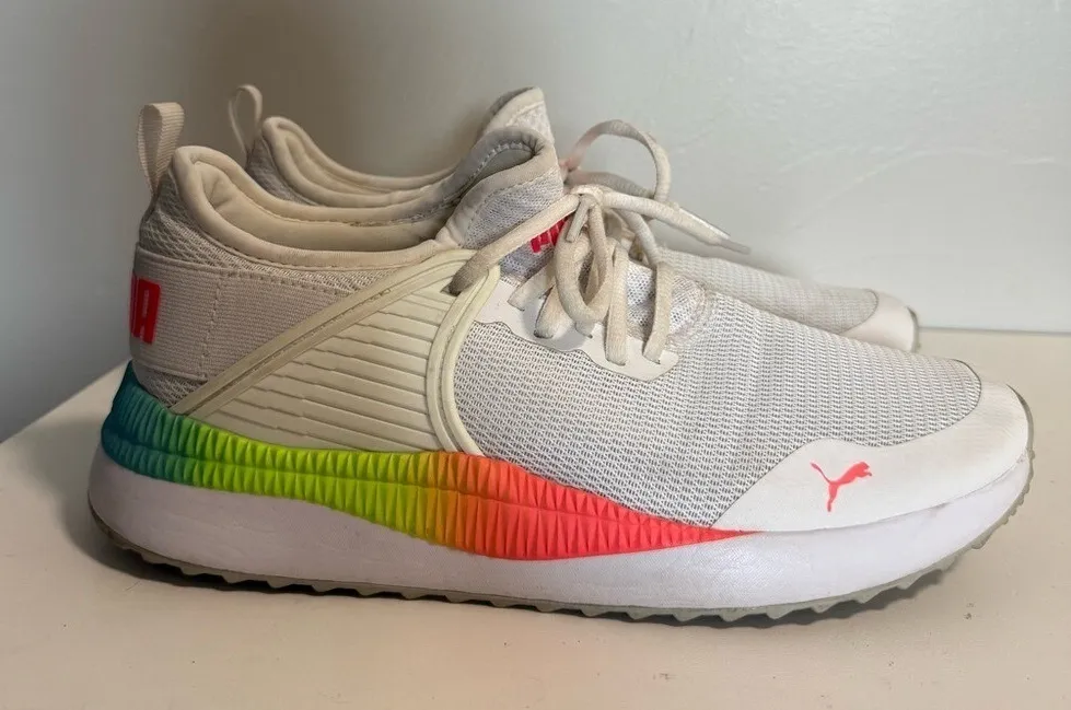 PUMA Pacer Next Cage Rainbow 372530-01 White Tennis Athletic Golf Shoe Casual 8.5 Good Condition
