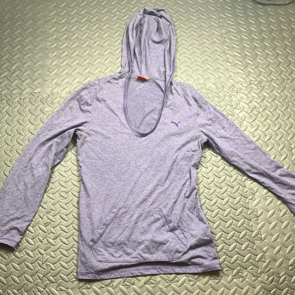 Puma Women’s Purple Hooded long sleeve shirt Size M-small stain not very noticeable Stylish blue h... Show more