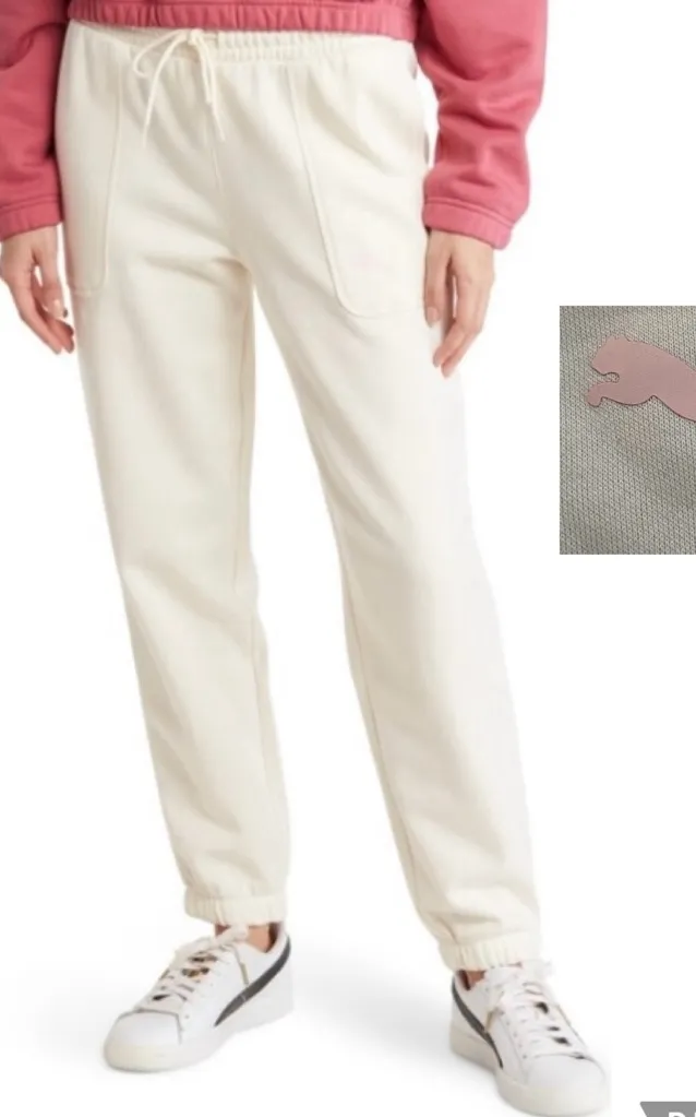 Puma women’s size medium joggers. Pants feature a 66/34 cotton/poly blend cream fabric; elasticated... Show more