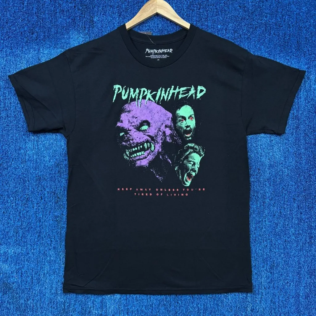 Pumpkin Head “ Keep Away Unless Your Tired of Living” Graphic Horror Movie T-Shirt Size Large 21 inches pit to pit and 30 inches long Amazing shirt perfect for Pumpkin Head fans New overstock in great condition