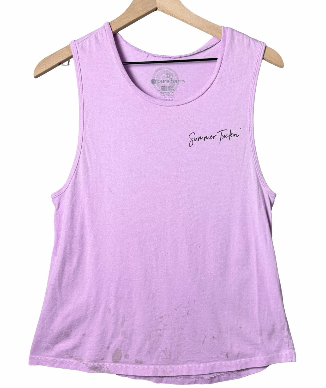In fair preowned condition. Has some spots along the hem in the front. I have stain treated it but with no luck. Maybe it could be tie-dyed. Keep it cool and comfy with this Pure Barre “Summer Tuckin” tank. Crafted from soft 100% cotton in a light pink hue, this sleeveless top is perfect for barre class, workouts, or casual wear. Details: • Brand: Pure Barre • Graphic: “Summer Tuckin” • Color: Light Pink • Fabric: 100% Cotton • Fit: Relaxed muscle tank style • Women’s Size Large Keywords: Pure Barre tank, summer tuckin, graphic tank, pink muscle tee, workout top, barre class shirt, athleisure, fitness wear, cotton tank, women’s size L