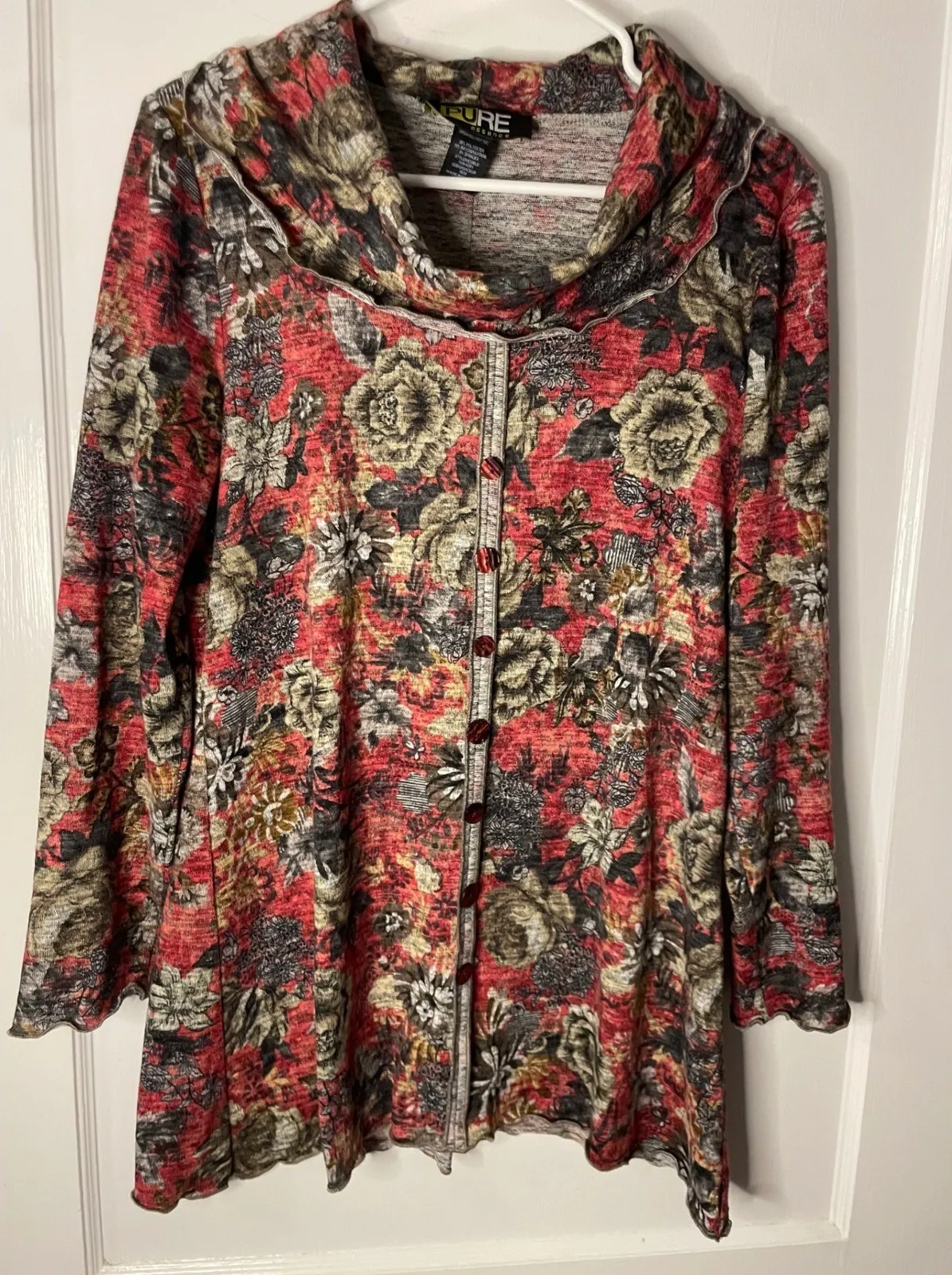 Measurements: • Bust: 19in measured flag • Length: 30 in Type: Tunic Department: Women Style: Tunic Material: Polyester, Rayon, Spandex Neckline: Cowl Neck Sleeve Length: Long Sleeve Sleeve Type: Classic/Fitted Sleeve Pattern: Floral Accents: Button Fit: Relaxed Keywords: floral print, cowl neck, button front, tunic, long sleeve, womenswear, casual, boho, artistic, statement piece, cozy, versatile, fall fashion, winter top P-5051