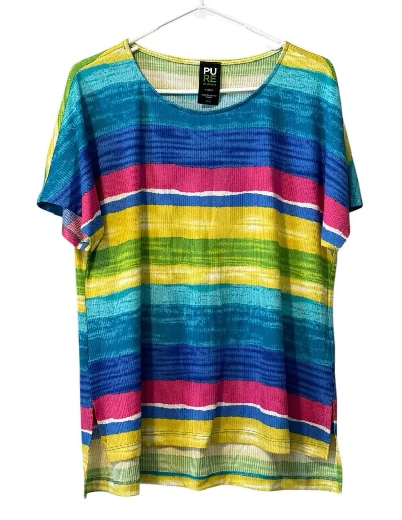 This shirt is preowned and in great used condition! Pure Essence Women Colorful Short Sleeve Stretchy Ribbed Size Medium Shirt ***Please be advised, color may appear more vibrant, lighter/darker in pictures due to flash, contrast, lighting or your phone/computer screen set up, etc. I try to described color as best as possible. I do check every item very closely while taking pictures and while packing it for shipping but it is very easy to still miss a stain or small damage. So please, if you receive an item with a defect not mentioned on the description, message me and I will do my best to fix the problem. Thank you! This item is pre-owned. Any questions please dont hesitate to ask.