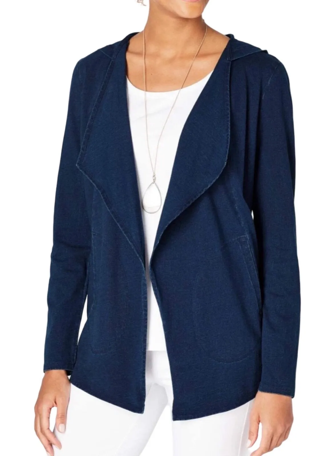 This Pure Jill wrap-style cardigan in Indigo comes in Women’s Petite XL and features a soft, breathable stretch knit with 100% cotton fabric, a functional hood, long sleeves, and a flattering wrap-front silhouette with a relaxed drape that makes it a perfect layering staple. Condition: excellent pre-loved condition. No rips, holes, stains, or structural flaws, and it shows no major signs of wear or damage. Measurements are not listed in the body of this description and are displayed in photos only, per standard measurement disclaimer. Ships quickly and packaged with care. All listings are crossposted.