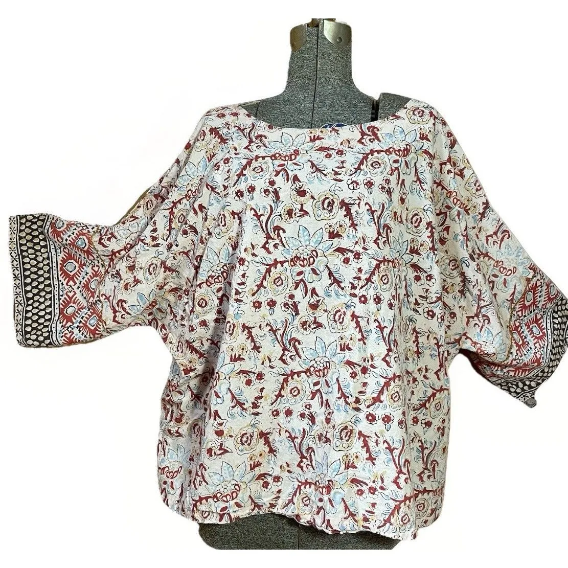 Condition: excellent Please note: There are a few faint linear marks in the fabric (see close-up photos). These appear to be natural variations in the weave or print process, not damage or stains. Pure Jill womens 2X top Made in India 100% organically grown cotton Beautiful batik-style floral print Wide scoop neckline kimono sleeves and contrast print cuffs. Approximate measurements (laid flat): Chest: 60” Length 25 1/2” pure jill, 2x, womens top, 100% cotton, organic cotton, boho, floral, batik, block print, made in india, kimono sleeve, oversized, relaxed fit, artisan, soft cotton, comfy, cottagecore, casual