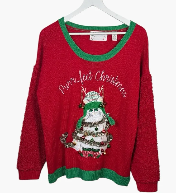 Purfect Christmas Cat Jingle Bell Ugly Christmas Sweater Sequins, tinsel, jingle bells Knit sweater body Fleece arms Very good condition! Underarm to underarm approximately 23”. Top of shoulder to bottom hem approximately 28”. W2059