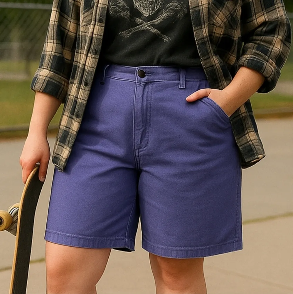 Vintage 90s Purple High-Waisted Skater Shorts | Carolina Bay 18W (36” Waist) Description: Retro purple vintage shorts with a high-rise fit and baggy skater cut. Made from a soft cotton/poly twill that feels like lightweight denim. True 90s grunge / Y2K revival vibes. Waist: 18” flat (≈ 36” around) Rise: High-waisted Tagged: 18W / 32 (fits modern women’s 16) Fabric: 65% polyester / 35% cotton Color: purple Style them oversized for that skater look or belt them for a more fitted wear. Perfect with Vans, band tees, and festival streetwear styling. 📸 Note: Model/mock-up photos are for styling inspiration. Please check measurements for best fit. 90s, Y2K, Skater, Grunge, Unisex, Plus Size, Streetwear, Festival, Normcore, Indie