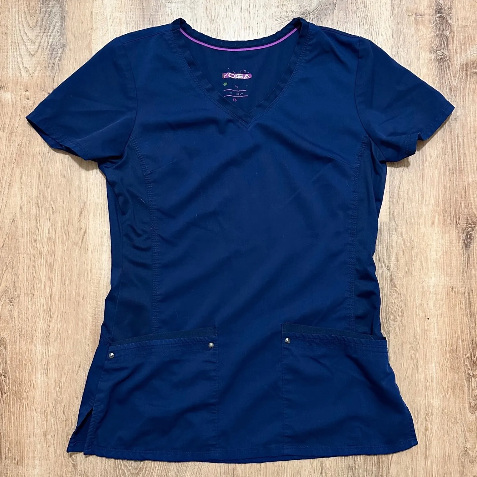 Discover ultimate comfort and style with this top. Designed to move with you, this navy blue v-neck top features short sleeves and functional pockets accented with subtle snaps, perfect for keeping your essentials close at hand. The flattering fit and breathable fabric make it ideal for long shifts or active days. Elevate your workwear with this essential piece, perfect for healthcare professionals, veterinary staff, or anyone seeking comfortable and durable everyday wear. - preowned, great used condition