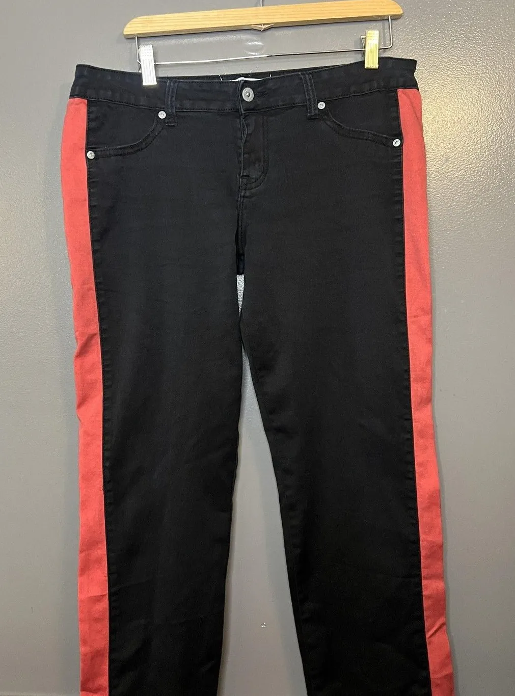 Lightly worn with minor wash wear and creasing from storage. No holes or stains observed. Zipper and button function properly. Brand: Puzzle Classic Jeans Wear (waistband label reads "Puzzle Classic Jeans Wear"). Inside tag: Puzzle Jeans Wear Tag size: 13. Color: Black with red racing/side stripe panels down both legs. Material: 95% cotton, 5% elastane (stretch); Made in China. Style: Skinny/straight-leg stretch jeans with belt loops and classic 5-pocket design. Features: Zip fly with button closure; back patch pockets; contrast side stripes for sporty look. Notes: Size 13 commonly aligns with juniors sizing; compare to a similar pair for best fit. Waist 34" has stretch Rise 9" Inseam 31" bin 23 1537