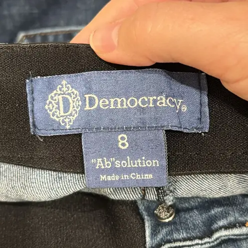 Democracy "Ab" solution Skinny Distressed Jeans Classic Denim Dark Wash Good used condition, size 8 Note mild puckering near zip fly Fabric provides stretch Distressed Accent Metallic detail Ankle length Slim, skinny fit 6 pocket style Zip fly with button closure Mid rise waist Elastic waistband with belt loops subtle whiskering and fading 54% Cotton 27% Rayon 17% Polyester 2% Spandex Measured flat: waist 15" rise 9" inseam 28.75" 15.6
