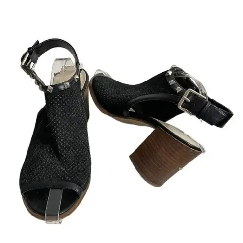 Perforated suede upper, studded around the top of the foot, adjustable sling back, 3” stacked block... Show more