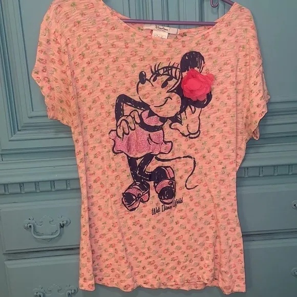 Walt Disney World Parks Minnie Mouse T-shirt floral pink -flower pin & glitter Size L - $29 - From Rosanna