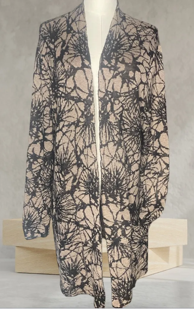 Peruvian Connection Knit Long Cardigan with Abstract Print A gorgeous, lightweight long cardigan from Peruvian Connection, featuring an abstract or botanical black print against a neutral beige/blush background. This open-front sweater is crafted from a luxurious, soft-knit blend perfect for year-round layering. The high-quality blend of 46% Pima Cotton, 40% Baby Alpaca, and 14% Nylon ensures a beautiful drape, incredible softness, and warmth without being too heavy. Style Details: • Silhouette: Long/Duster length, open front • Pattern: Abstract, Botanical, or Branch-like print • Color: Black and Beige/Blush (or "Taupe" or "Neutral") • Fabric: Soft knit Pima Cotton/Baby Alpaca Blend •Front open pockets •"Excellent pre-owned condition, no visible flaws. Measurements Length 35” Bust 23” •This is a timeless piece great for work, travel, or a stylish casual look. • Brand & Fabric: #PeruvianConnection #PimaCotton #BabyAlpaca #AlpacaBlend #Knitwear #LuxuryKnit • Style: #Cardigan #LongCardigan #DusterCardigan #OpenFrontSweater #LightweightCardigan #LayeringPiece • Pattern & Color: #AbstractPrint #BotanicalPrint #NaturePrint