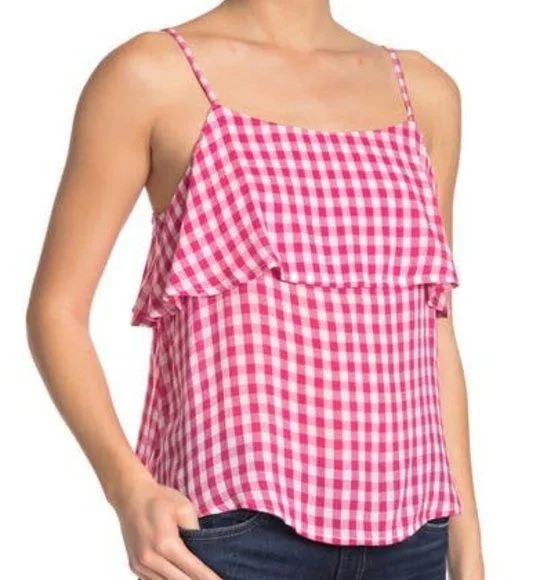 Abound Tiered Spaghetti Strap Tank Top. This lightweight tank features a flirty ruffled tier and a vibrant pattern for perfect summer style. Pullover. Adjustable spaghetti straps. Ruffle popover. Double layer detail at neckline. Lightweight woven construction. Material: 100% rayon. Pink and white gingham.